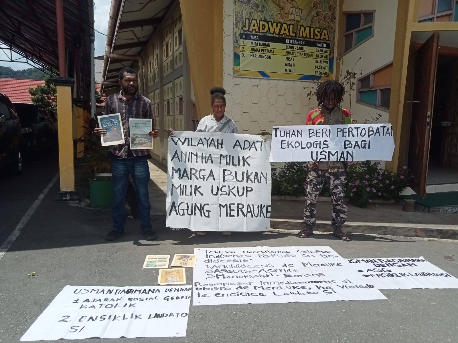 Aksi ke-6 penolakan dukungan Uskup Agung Merauke Mgr. Petrus Canisius Mandagi, MSC (USMAN) terhadap Proyek Strategis Nasional (PSN) di Tanah Anim-Ha, Selatan Papua. Aksi bisu dengan memegang spanduk berisi teguran berlangsung di Gereja Katolik Paroki Kristus Terang Dunia Waena, Keuskupan Jayapura. Pada Minggu 22 Februari 2026 merupakan hari Minggu Prapaskah I. Pesta tahta Suci Santo Petrus, Santa Margaretha dari Cortona, Pengaku Iman, dengan warna liturgi ungu.